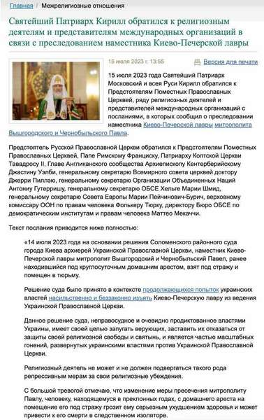 У своєму зверненні Кирило закликав вжити заходів для захисту митрополита УПЦ «МП», оскільки арешт нібито може призвести до його смерті. Він також заявив, що митрополит Павло зазнав репресій з боку української влади через свої релігійні переконання.