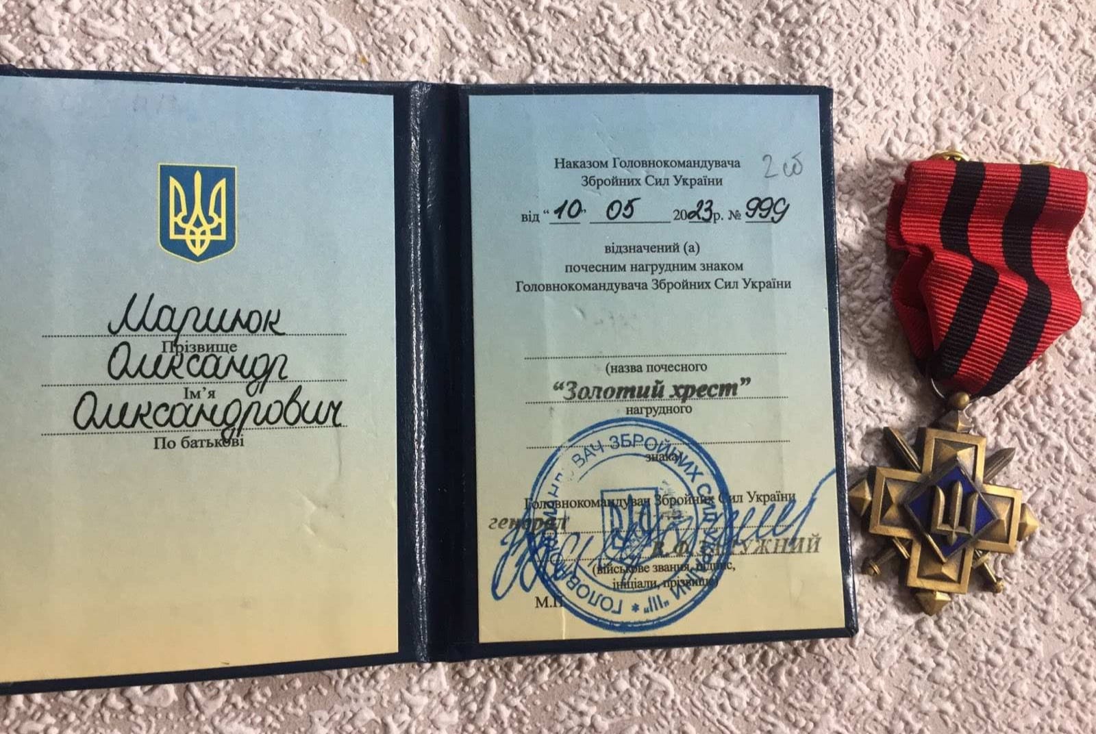 Військовослужбовець з села Городині Торчинської громади Олександр Мариюк отримав почесний нагрудний знак «Золотий хрест» від Головнокомандувача ЗСУ Валерія Залужного.