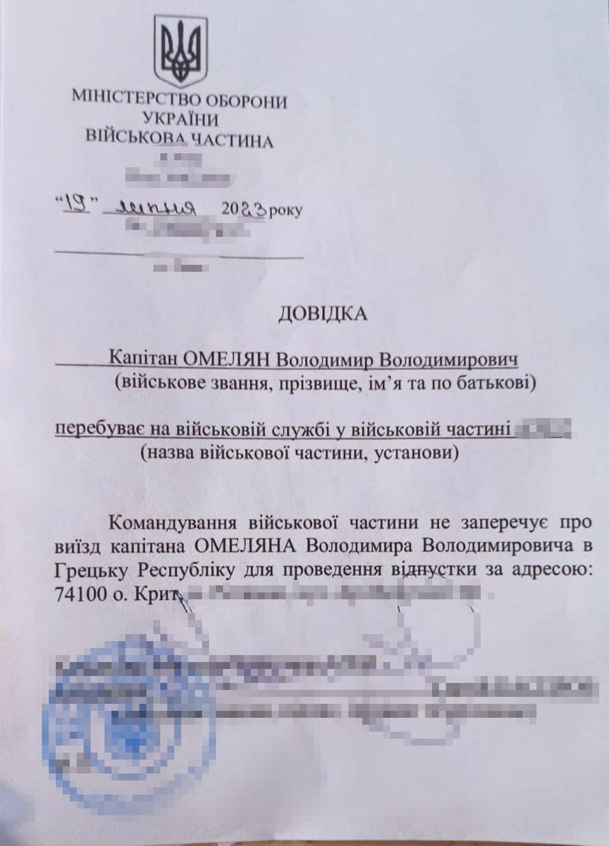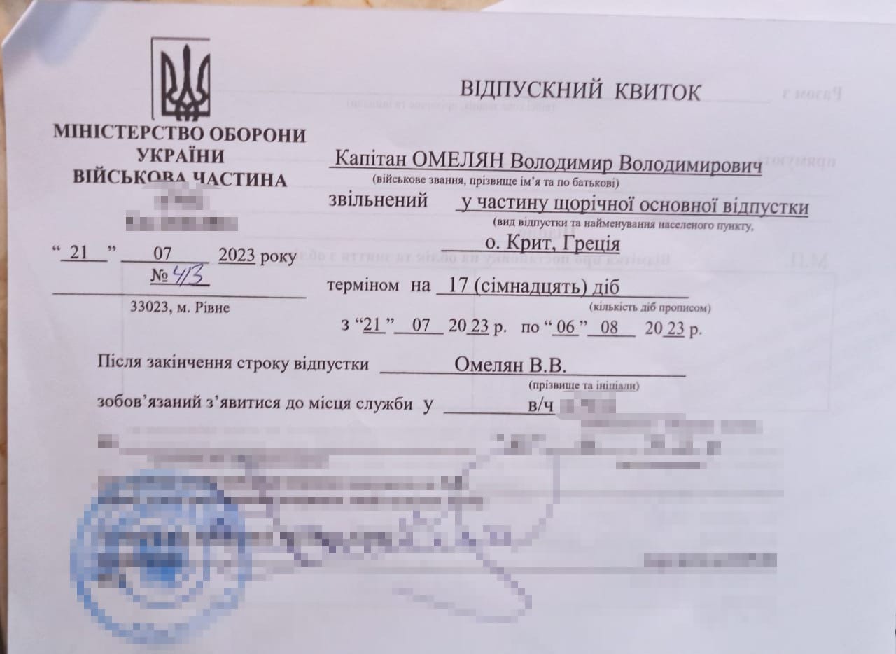 21 липня командир в/ч в якій служить Омелян, полковник Сергій Каспров, підписав ексміністру відпуску на острів Крит на 17 днів в місто Ретімно.