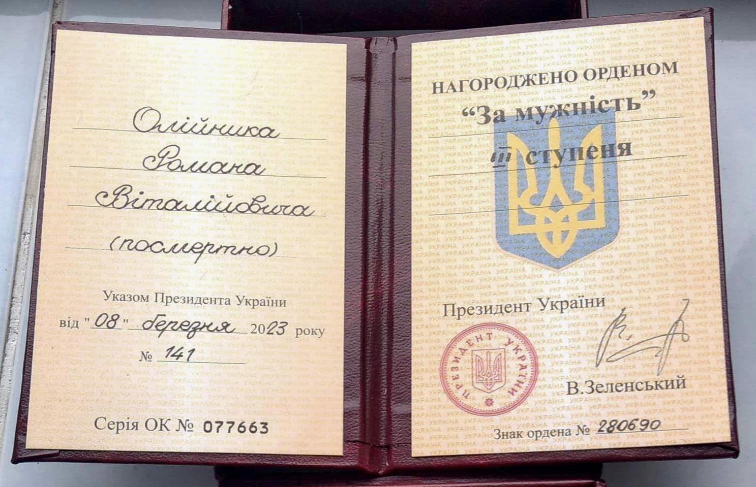Президент Володимир Зеленський посмертно нагородив орденом «За мужність» військовослужбовця Романа Олійника з Когильного Зимнівської громади.