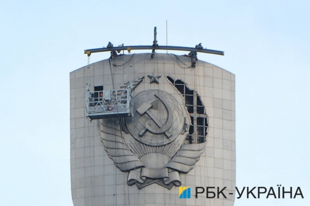 В Києві розпочали демонтаж радянського герба на монументі "Батьківщина-Мати". Закінчити роботи із заміни герба на український мають до Дня незалежності.