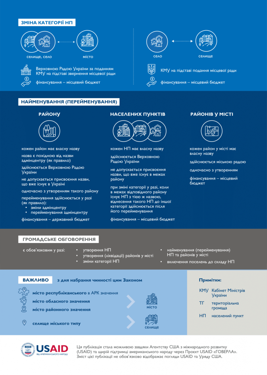 Так, в Україні більше не буде селищ міського типу. Населені пункти з компактною забудовою і чисельністю населення понад 10 тисяч мешканців матимуть статус міст.