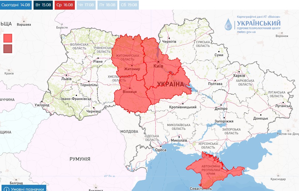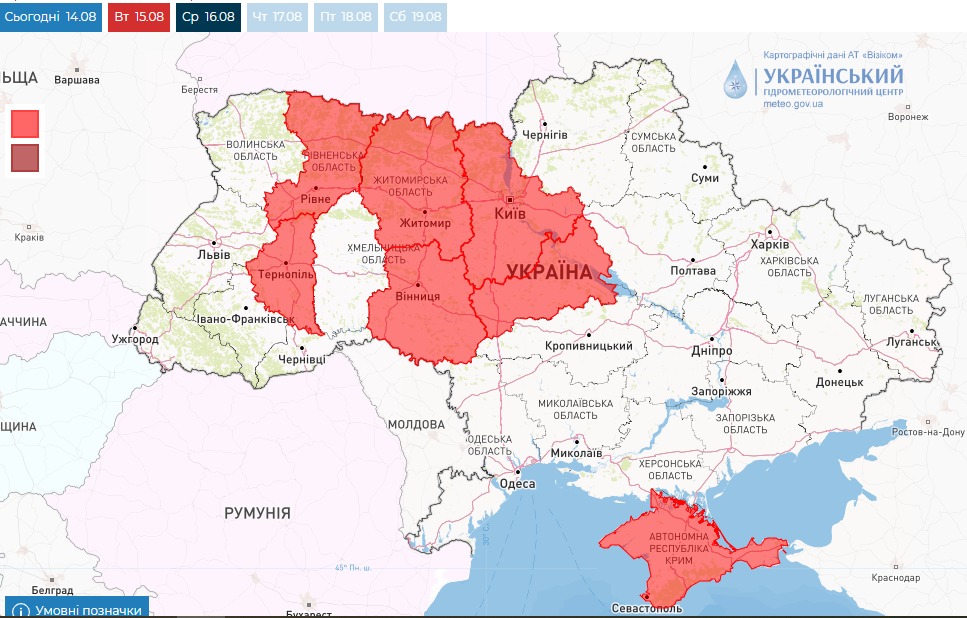 Повідомляється, що 14-17 серпня надзвичайний рівень пожежної небезпеки переважатиме у Київській, Житомирській, Вінницькій, Черкаській області та в Криму, 16-17 серпня – в Тернопільській та Рівненській областях, 17 серпня – у Хмельницькій та Волинській областях.
