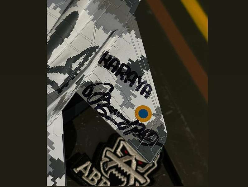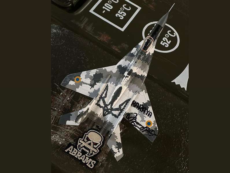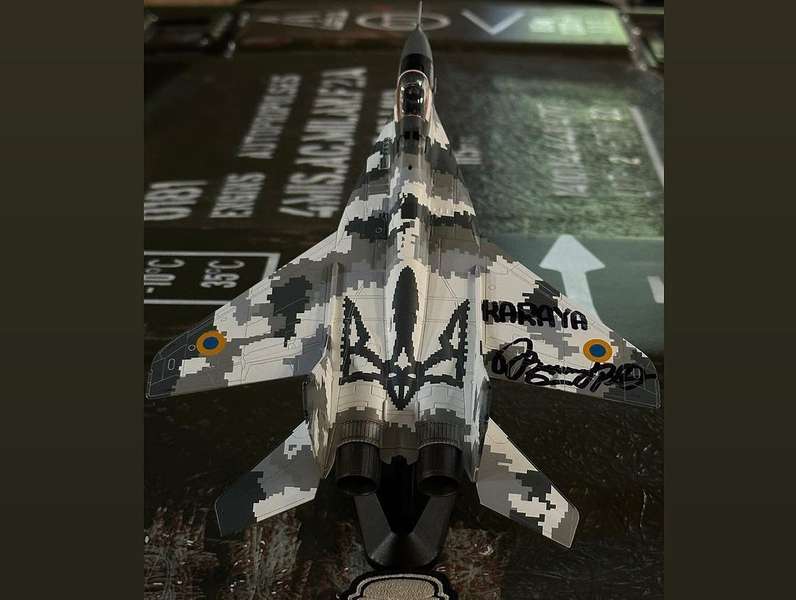«В руках у нього модель літака МіГ-29 бортовий номер 57, саме на котрому, KARAYA здійснив свій перший тренувальний політ (самостійний) на даному типі винищувача. Нажаль, цей літак б/н 57 втрачений у ході бойових дій, але пам’ять про нього залишилась», – йдеться в повідомленні.