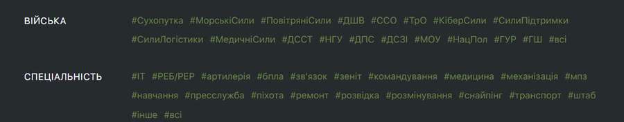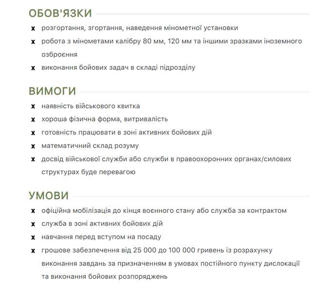 На сайті представлені різні вакансії: бойові, медичні, технічні та й творчі. Тут шукають розвідників, снайперів, водіїв-механіків, піхотинців, а також дизайнерів і СММ-ників.