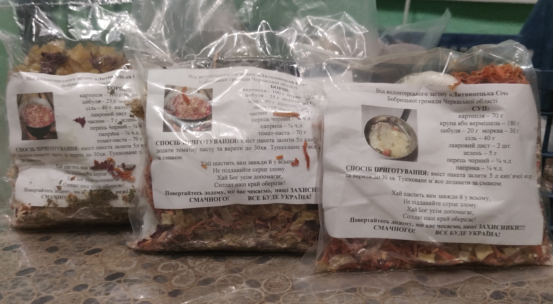 Кожен пакунок із сухими супами й борщами містить не лише склад, а й поради щодо приготування. Також волонтери додають побажання для воїнів. Фото: ШоТам.