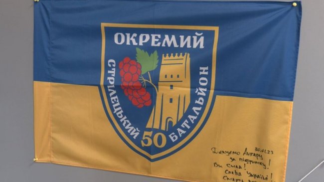 Ще одне синьо-жовте полотнище із емблемою 503-ого окремого батальйону морської піхоти волонтери отримали від підрозділу. Для цих військових, сказала Ірина Новосад, раніше передавали пікап.