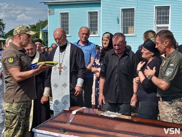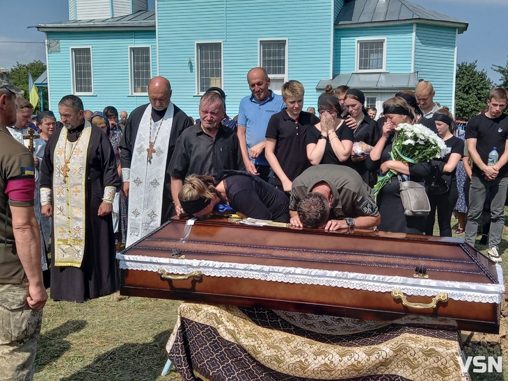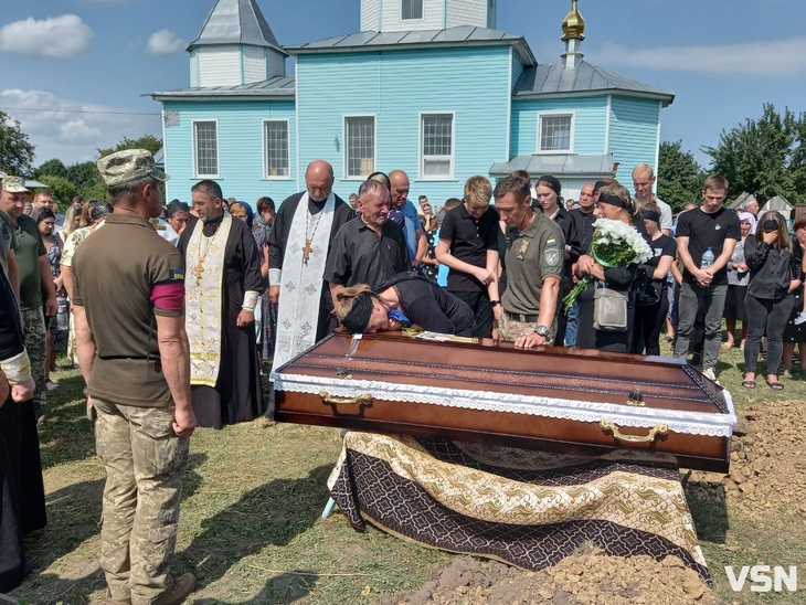Люди не тамують сліз. Ридає згорьована мама. Тато намагається триматися. Він теж військовослужбовець. Приїхав востаннє побачитися зі сином, який для нього завжди був героєм. Тепер його кровинка – Герой України. Поряд з домовиною воїна – ще зовсім маленькі донечки. Вони не розуміють чому всі довкола сумні. Дивляться на заплакану маму і собі починають плакати.