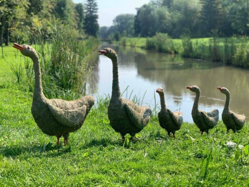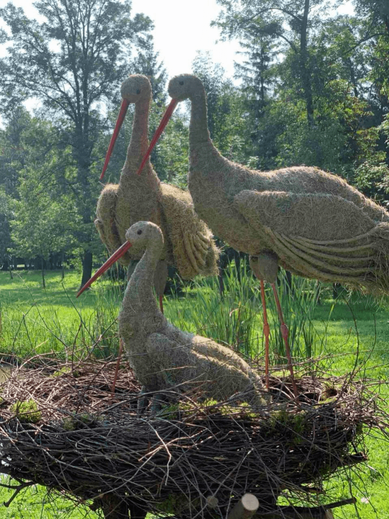 Роботи виконані із лісової трави, сформовані з макетів птахів: лелеки та гуси, які є оберегом родинного затишку, добробуту і злагоди, символізують любов до рідної землі, до Батьківщини.