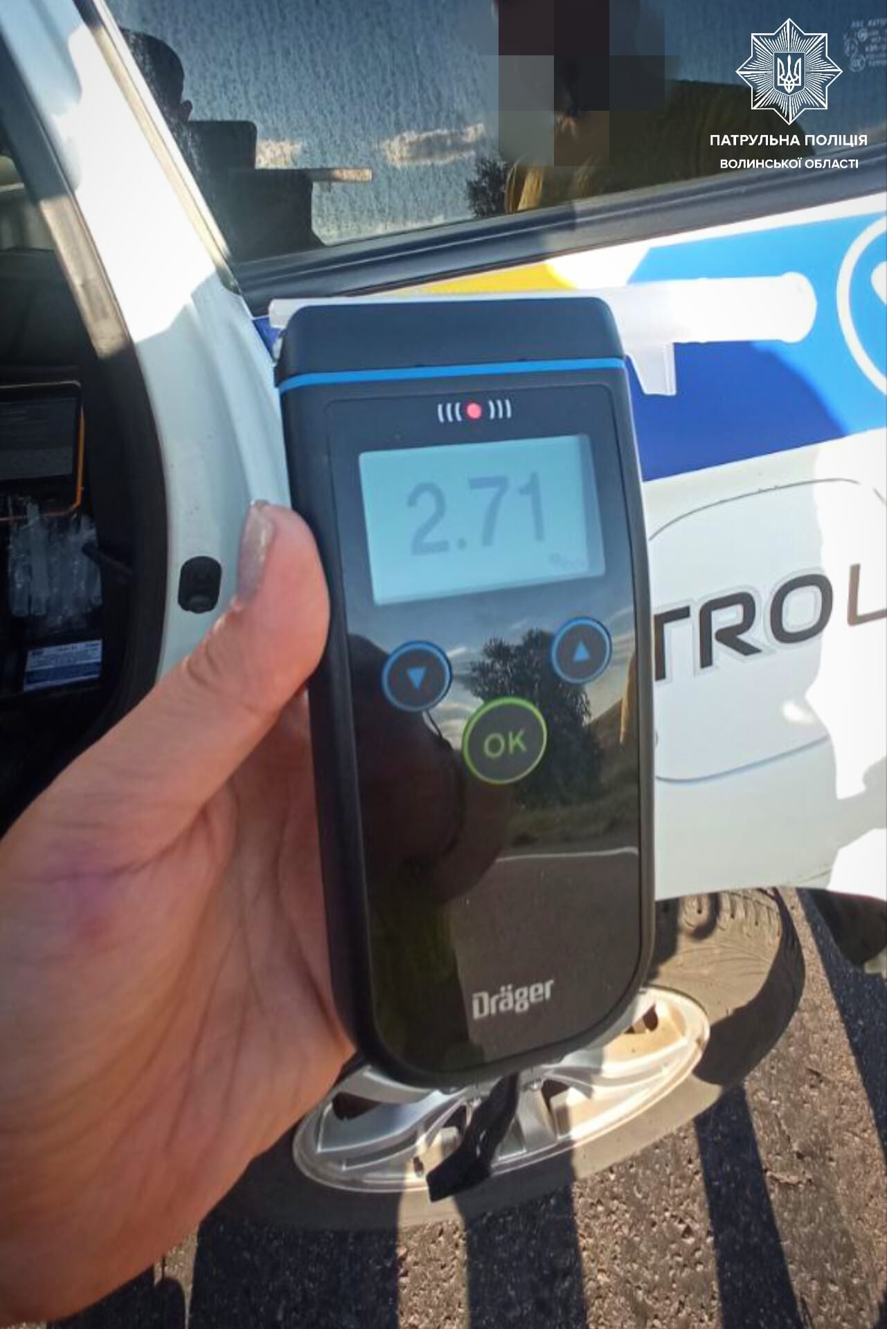 Через кілька хвилин інспектори зупинили схожий за описом транспортний засіб, коли той проїжджав повз. Під час спілкування з водієм поліцейські й справді виявили у нього ознаки алкогольного сп’яніння та запропонували пройти огляд за допомогою приладу Drager. Результат виявився позитивним — 2,71 проміле.