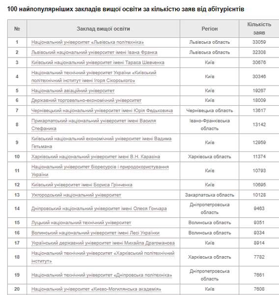 Цьогорічними лідерами за кількістю заяв від абітурієнтів, які вступають на основі повної загальної середньої освіти, є львівські виші: перше місце – Львівська політехніка (33 059 заяв), друге місце – Львівський національний університет ім. Франка (32 308 заяв).