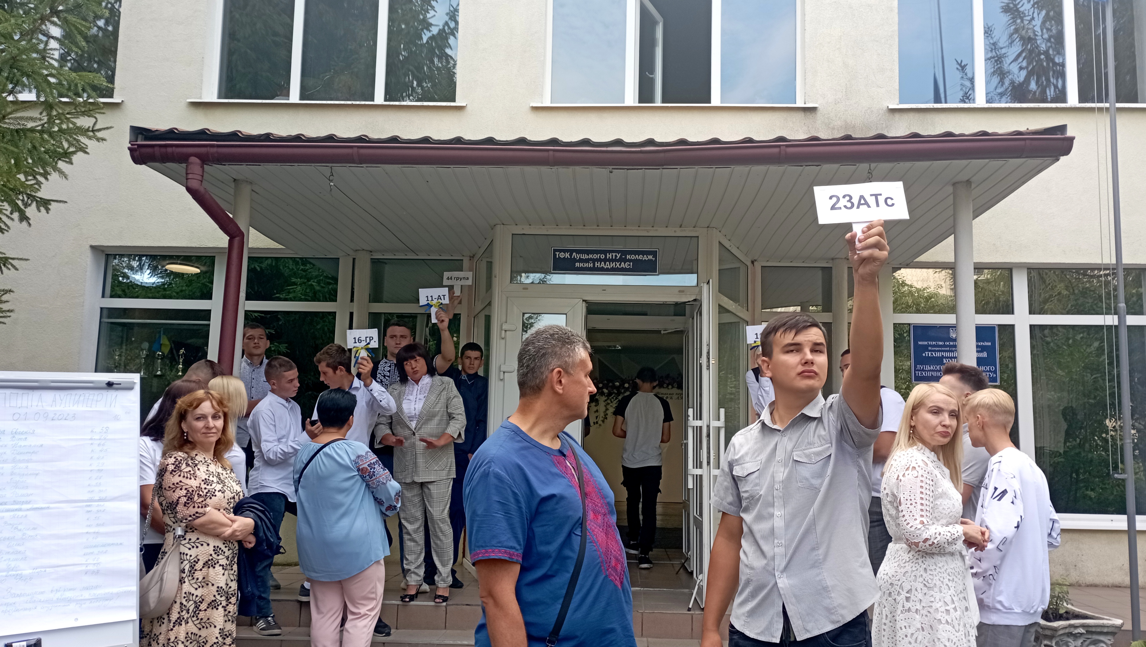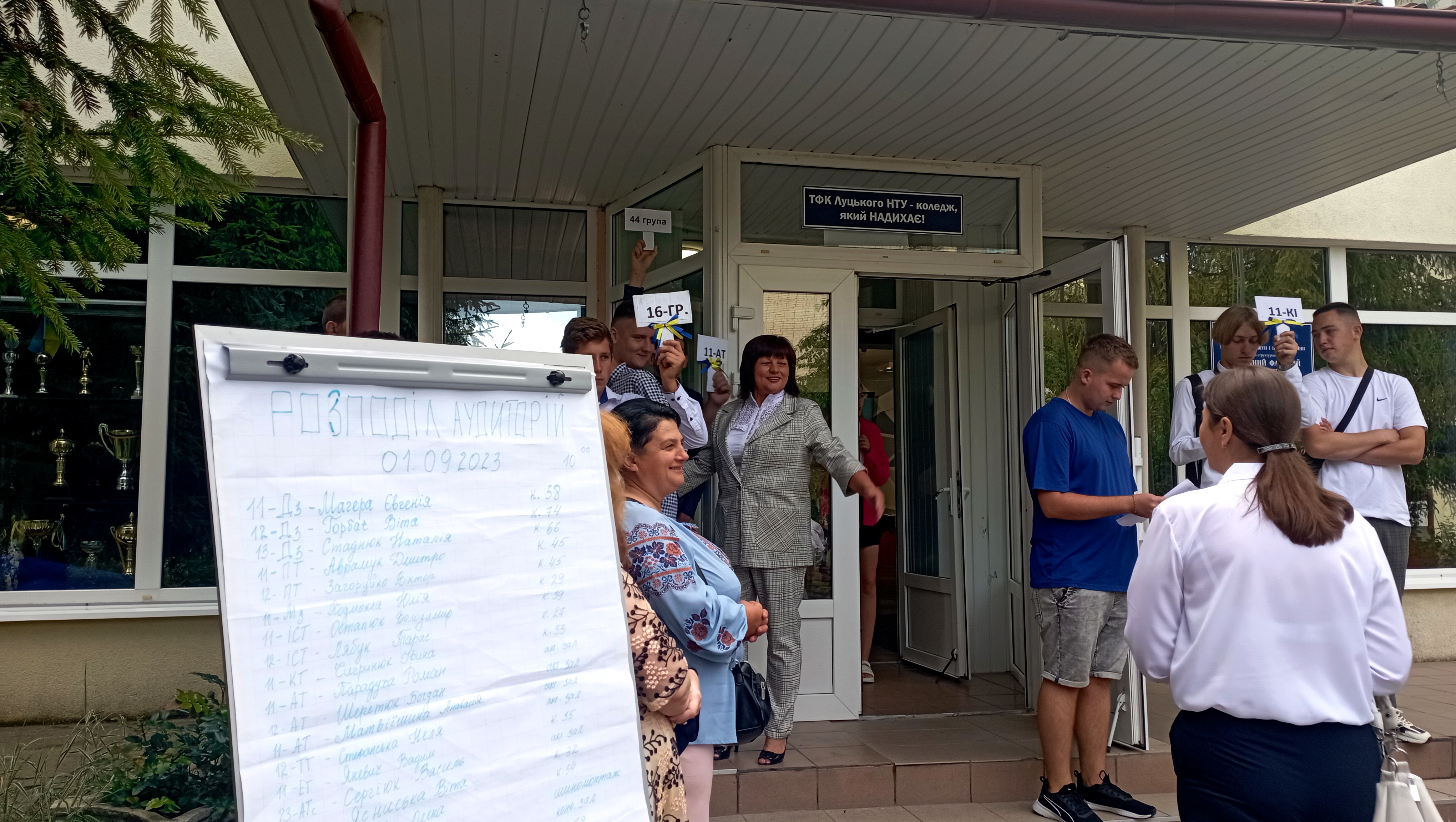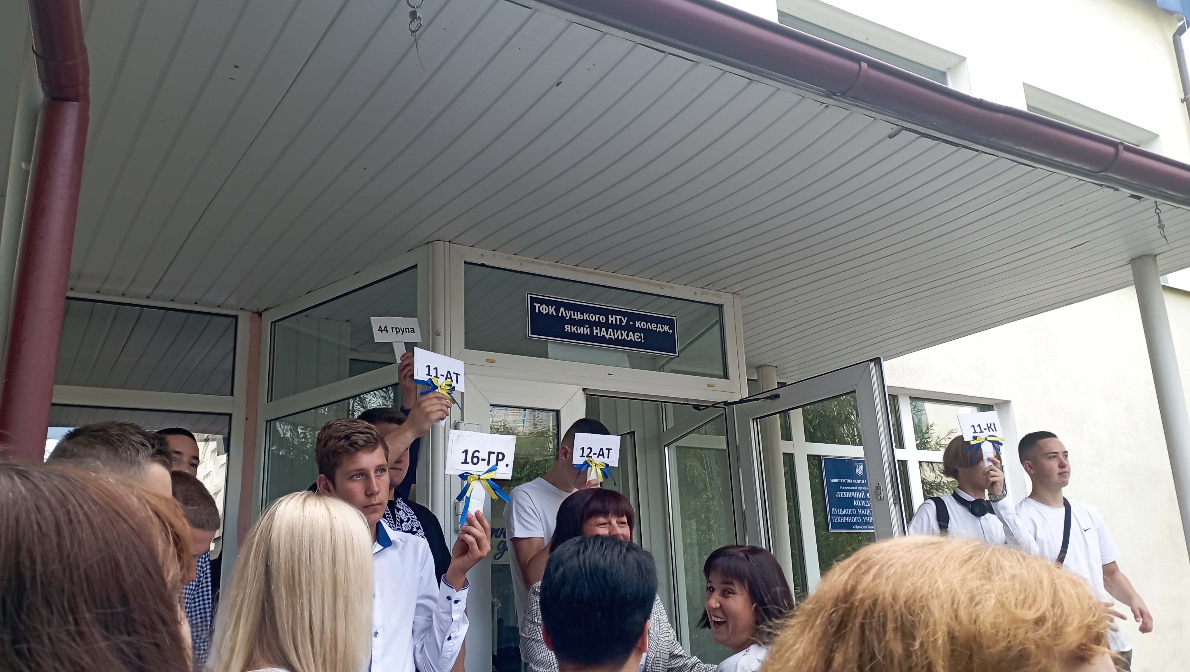 Студентів перших курсів зібрали біля коледжу та розподілили по аудиторіях, де їх познайомили з навчальними керівниками та обговорили основні положення навчального процесу.