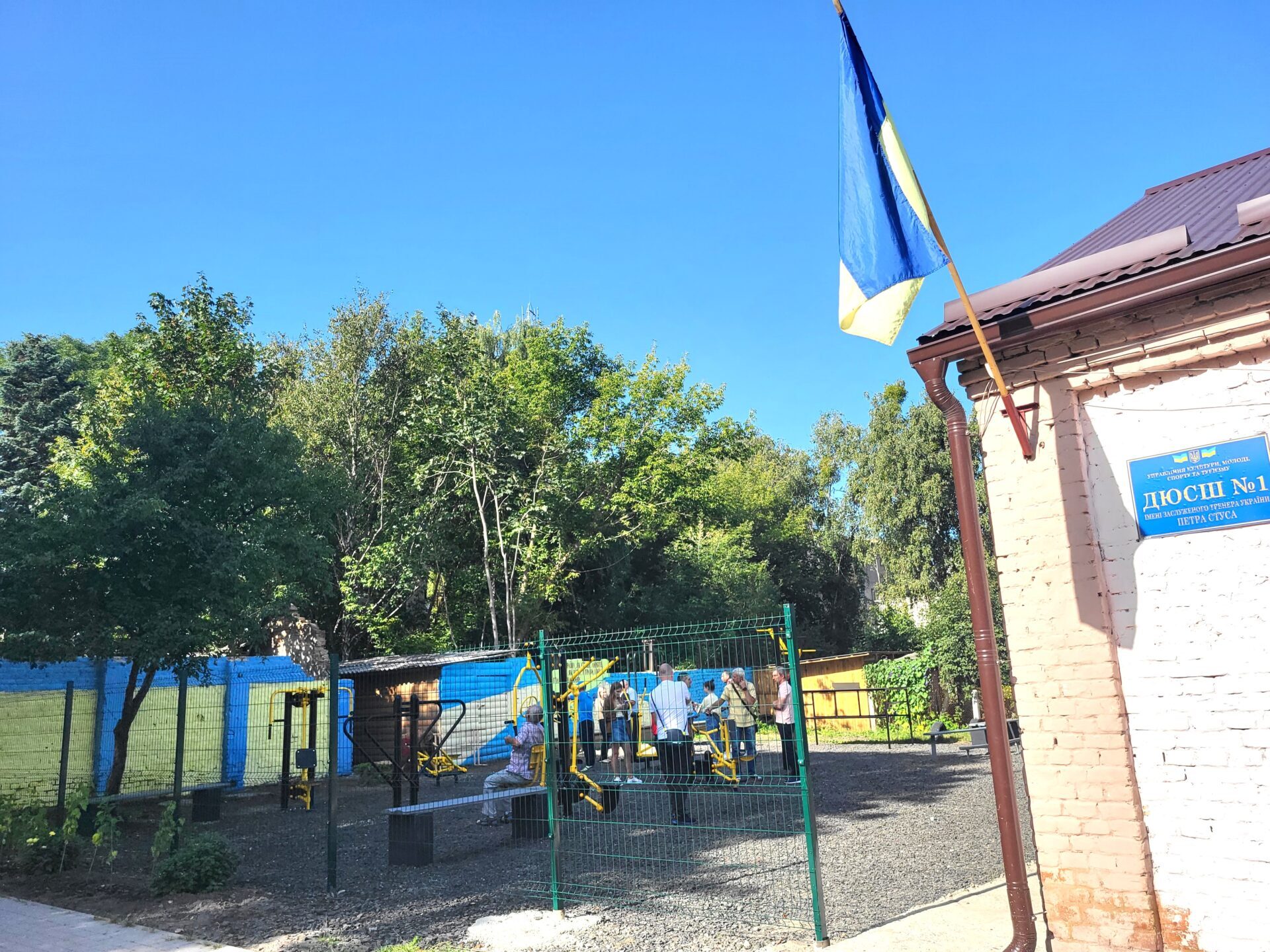 Територія навколо спортивного закладу останнім часом постійно оновлюється. Продумали тут і дизайн стіни поруч, зобразивши на ній карту України, посадили кущі, привели усе до ладу.