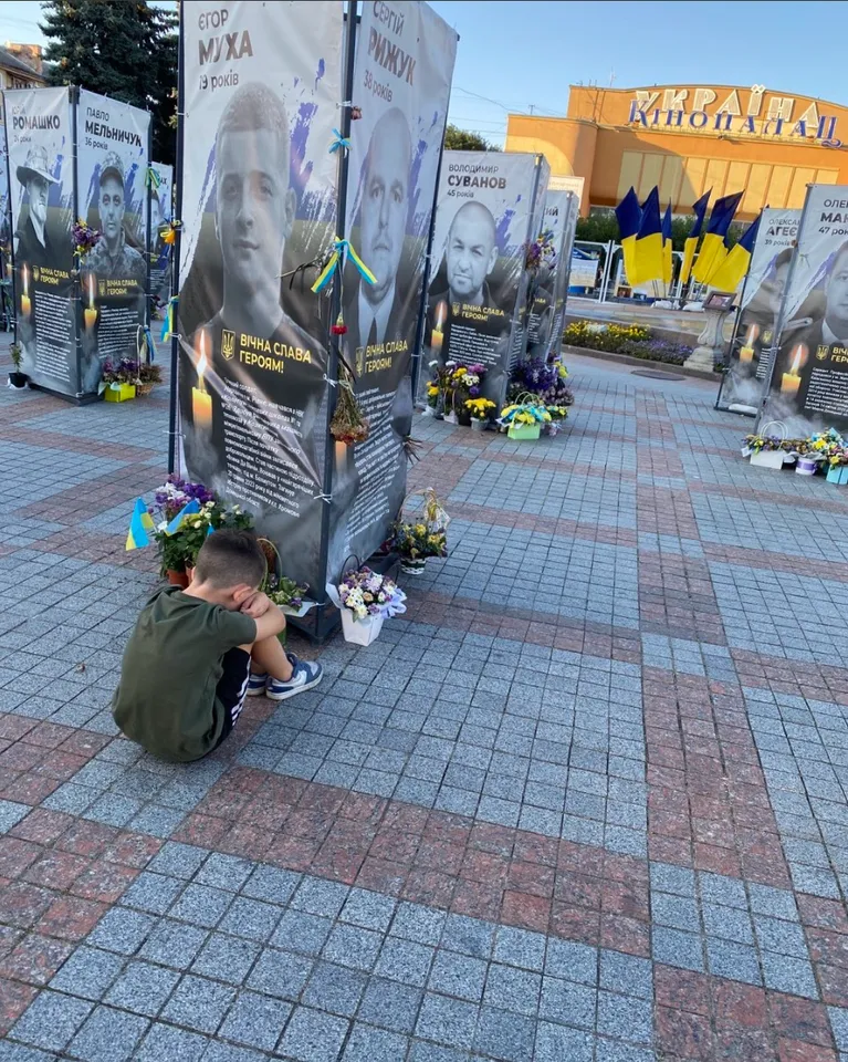 На світлині хлопчик сидить на бруківці перед світлиною Єгора. Він поклав собі голову на коліна та затулив її руками, що демонструє весь той біль, який є всередині маленького українця.