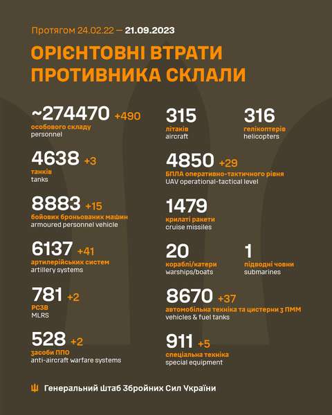 Загальні бойові втрати противника з станом на 21.09.23 орієнтовно склали