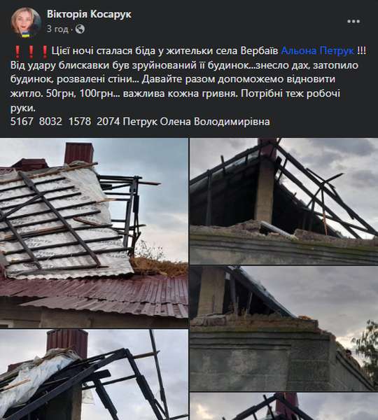 «Від удару блискавки був зруйнований її будинок...знесло дах, затопило будинок, розвалені стіни», – йдеться в дописі.