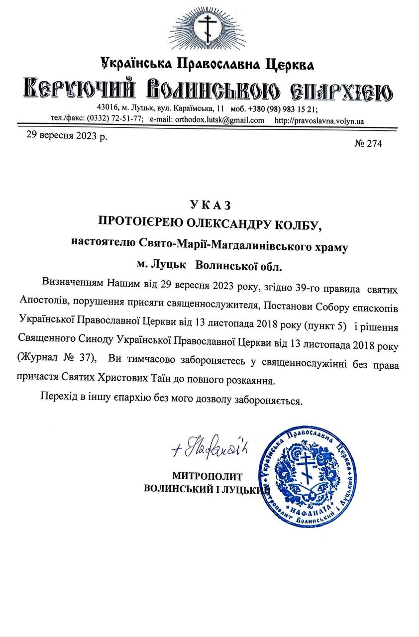 29 вересня архієрей УПЦ МП у Луцьку Нафанаїл видав указ настоятелю Свято-Марії-Магдалинівського храму м. Луцьк Волинської області отцю Олександру Колбу про «заборону» у священнослужінні.