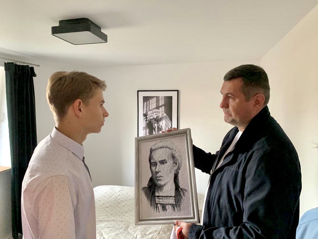 Голова Волиньради Григорій Недопад прибув на захід не з порожніми руками. Юним мешканцям новобудови він подарував портрети Лесі Українки вишиті на полотні.