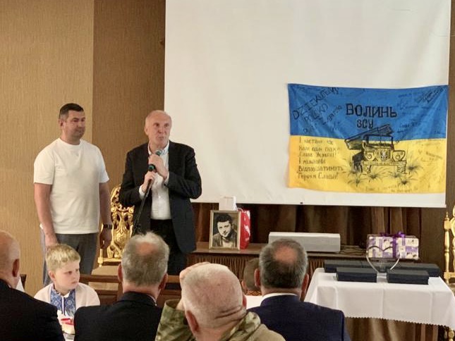 На знак великої вдячності голові Фундації «Честь допомагати дітям» Пйотру Зигарскі Григорій Недопад подарував бойовий прапор 14-ї окремої механізованої бригади ім. князя Романа Великого, привезений з Куп’янська.