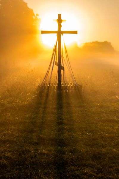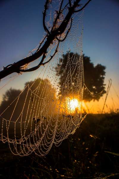 На фото – густий туман над річкою Стир, пронизаний промінням ранкового сонця. У мереживі павутиння, наче намисто, застигли краплі роси.