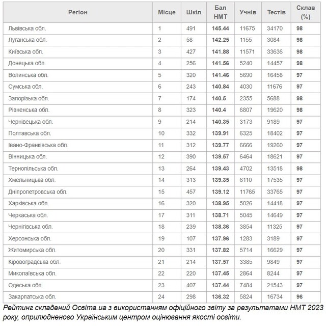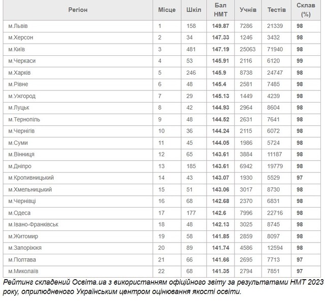 Інформаційним освітнім ресурсом «Освіта.ua» складений рейтинг обласних центрів та областей України за результатами національного мультипредметного тесту 2023 року.
