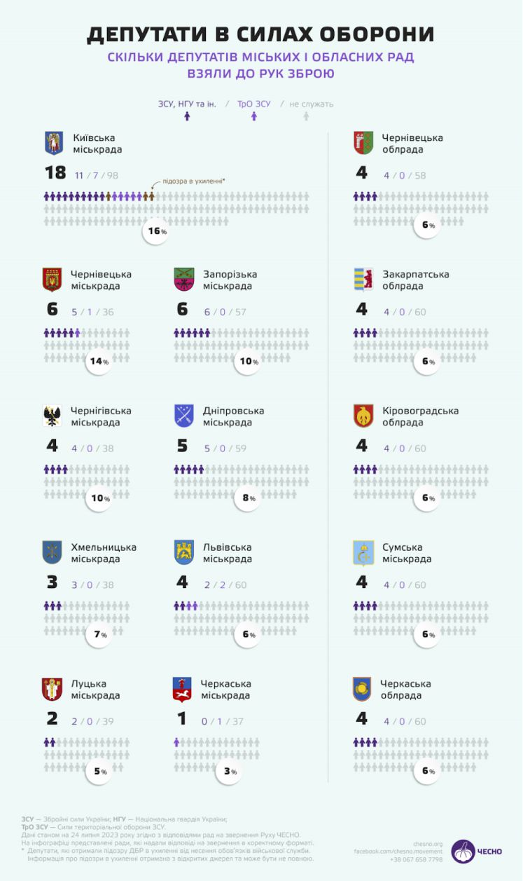 Загалом отримано дані від дев’яти міських рад обласних центрів та п’яти обласних рад. Це пояснюється тим, що ради не зобов’язані мати інформацію про деталі військової служби депутатів. Саме тому рух «Чесно» паралельно зробив запити до політичних партій і підготував окреме дослідження «Депутати не служать. Хто сказав?».