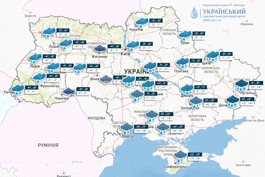 У центральних, Харківській та Сумській областях передбачається сніг, який перейде в дощ удень, супроводжуваний ожеледдю та налипанням мокрого снігу. Температура повітря вночі та вдень становитиме від 3° морозу до 2° тепла.