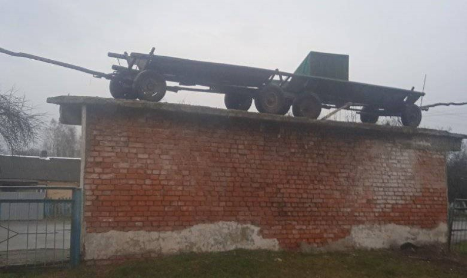 Зокрема, на дах зупинки витягли два вози та частину колодязя. Ще один віз затягли у саму зупинку й перевернули догори колесами.