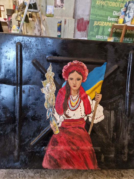 Представникам литовської влади та друзям України в Литві подарували незвичайні картини – їх написали на плитах з бронежилета українського захисника юні художники з Рожищенського будинку дитячої творчості. На пластинах видно сліди від куль. Їх привезли з Авдіївки, де український захисник отримав поранення.