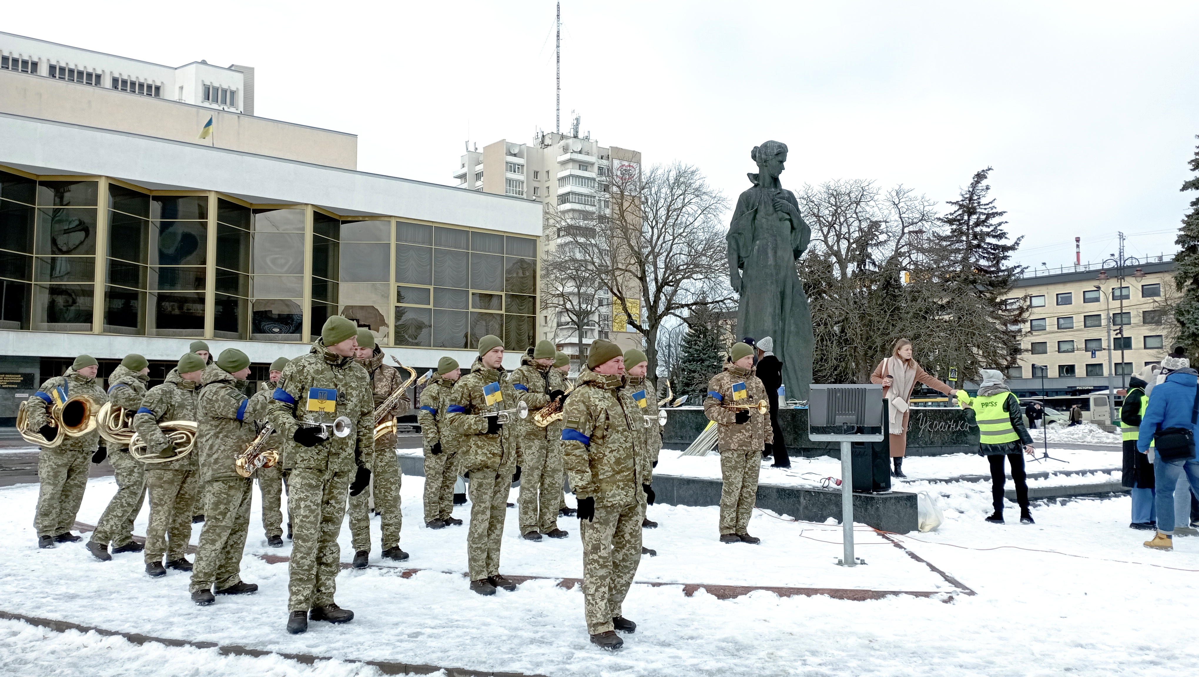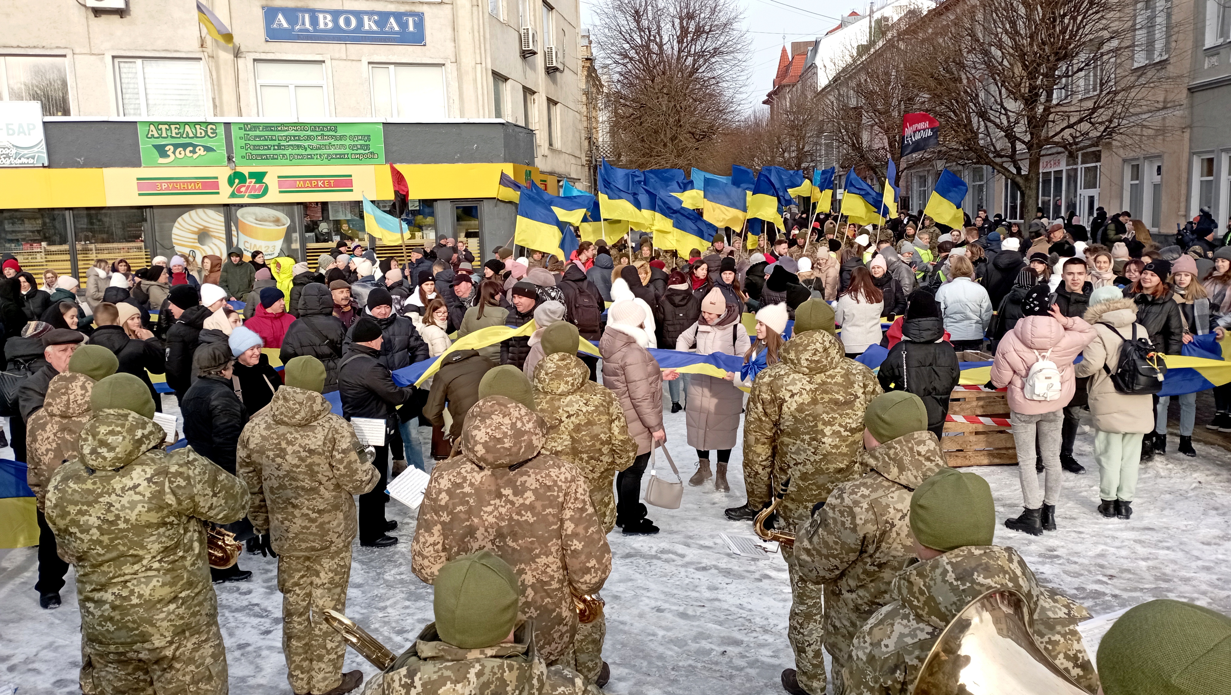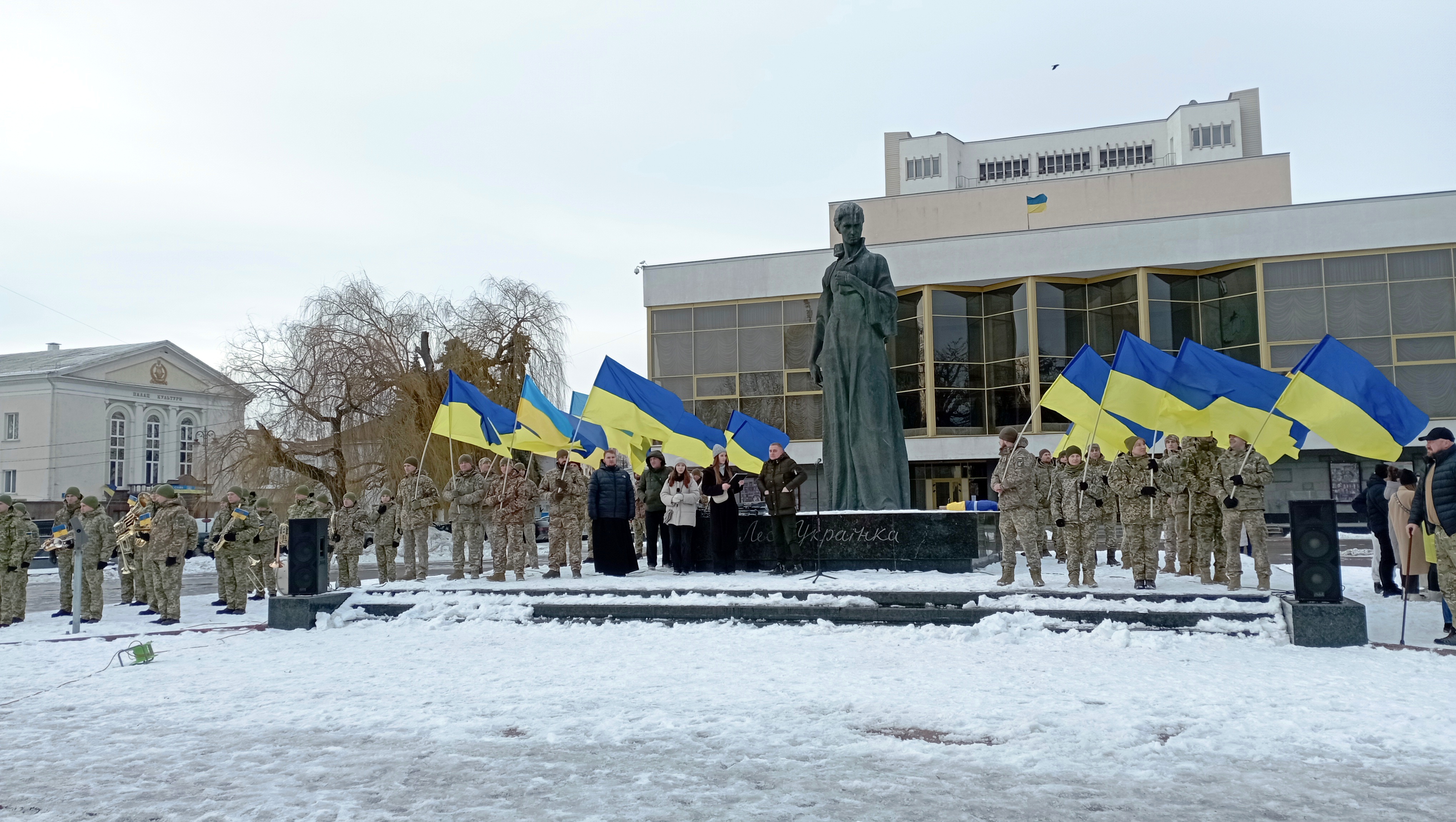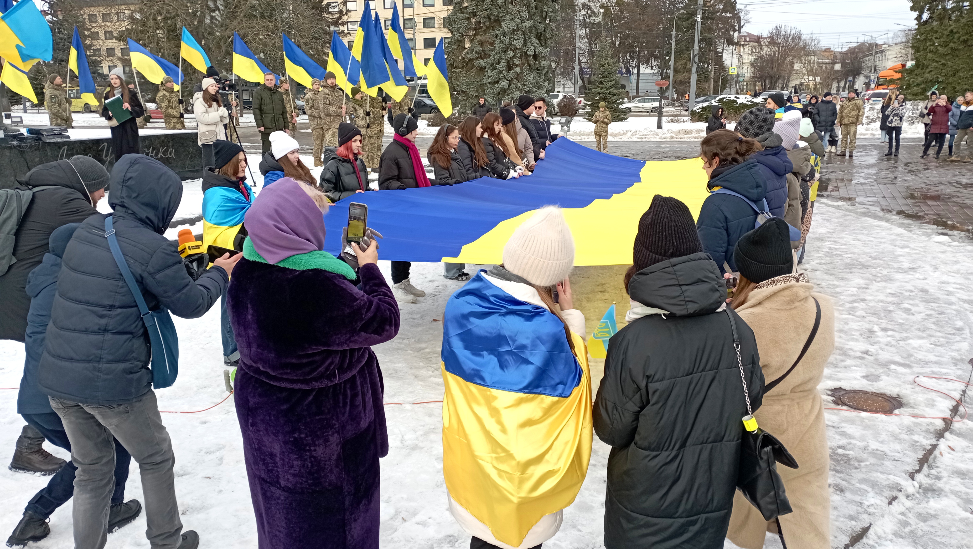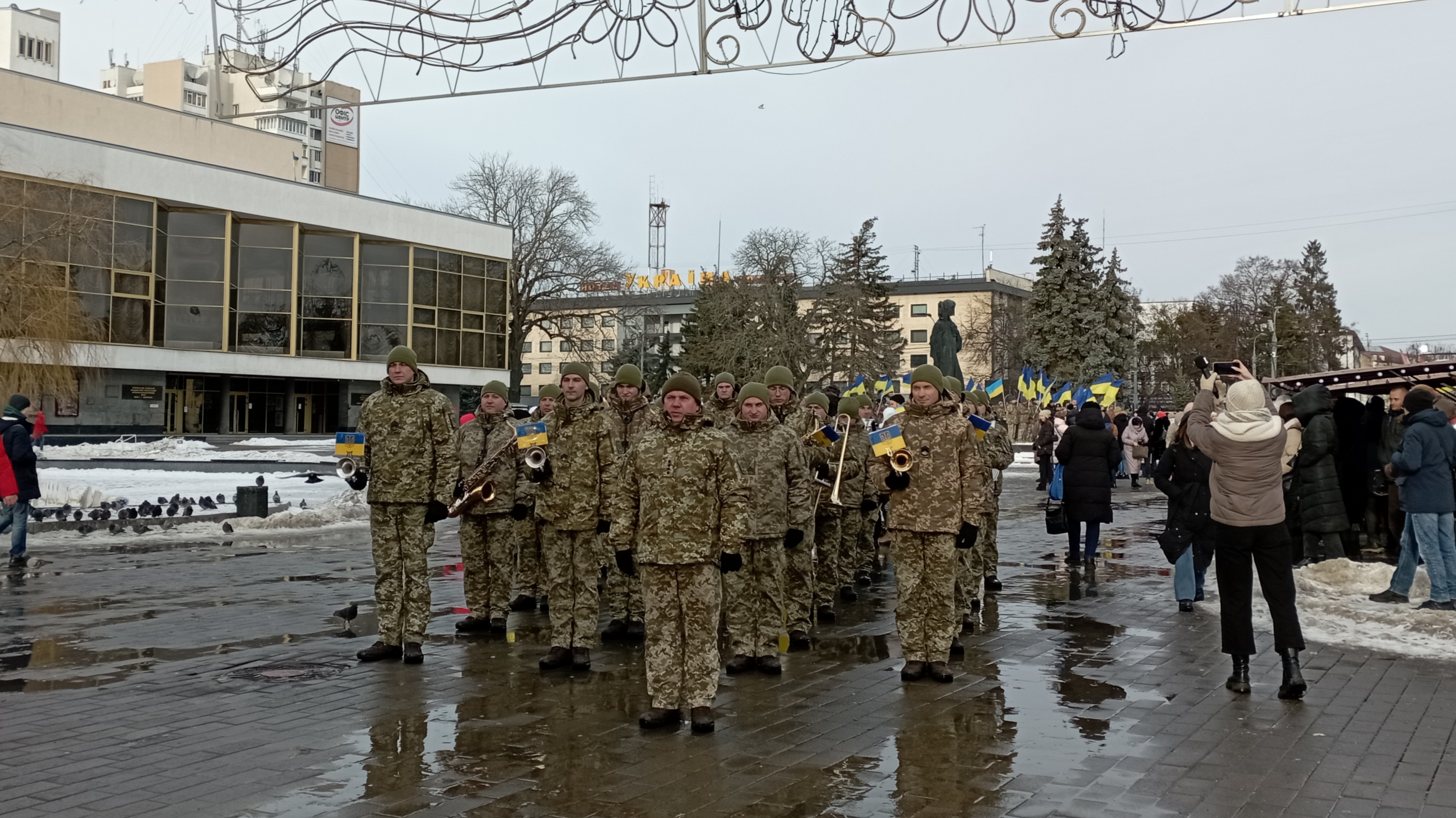 Сьогодні урочистий захід відбувся пізніше через повітряну тривогу. Попри це на Театральному майдані зібралась величезна кількість людей, щоб відзначити цю подію.