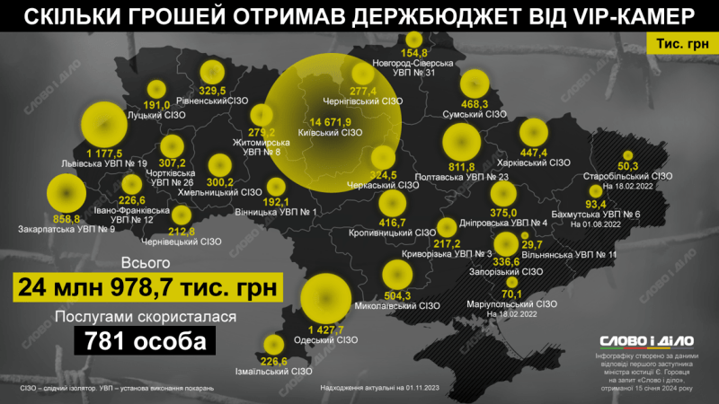 Більше половини цієї суми становив дохід від платних камер у Київському СІЗО – 14 млн 671,9 тисячі гривень. В одному з ефірів міністр Денис Малюська розповідав, що у Києві «платні камери завжди у дефіциті».
