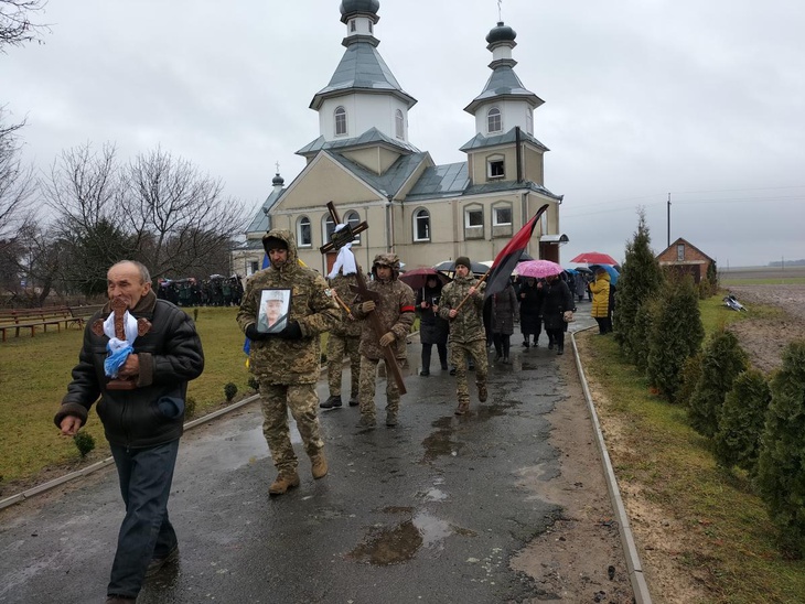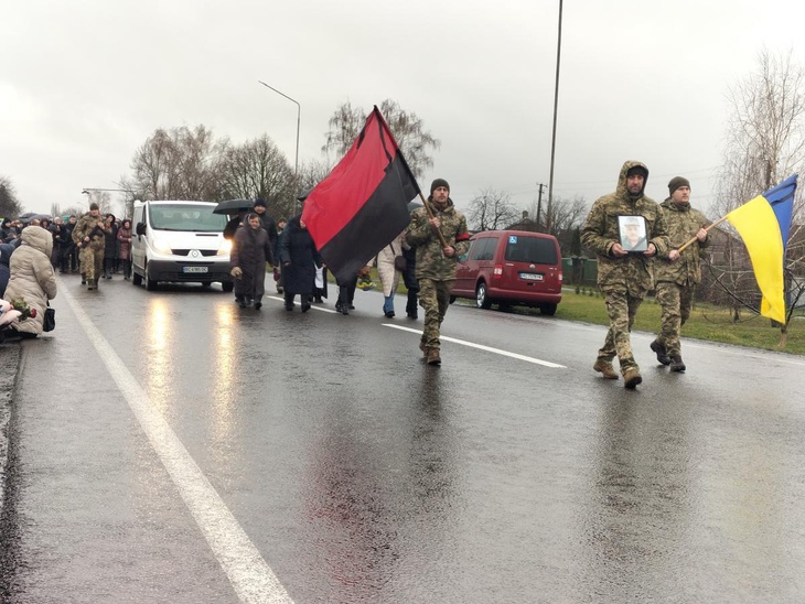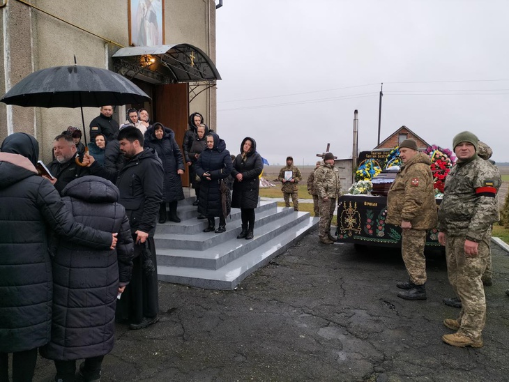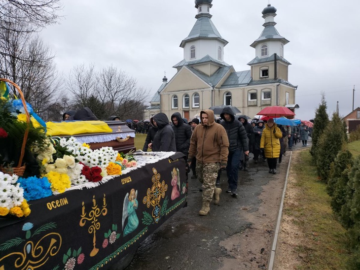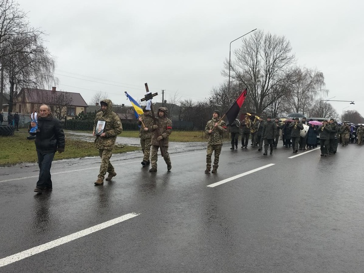 Після короткої молитви траурна процесія вирушає до місцевого храму, де відбувся чин відспівування загиблого захисника України.