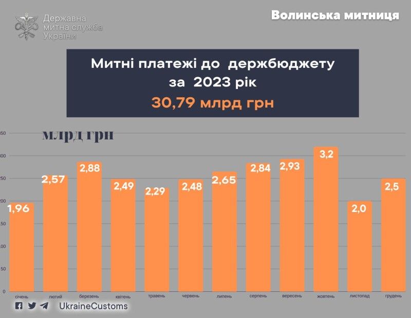 У 2023 році із зони діяльності Волинської митниці до державного бюджету надійшов майже 31 мільярд гривень митних платежів.