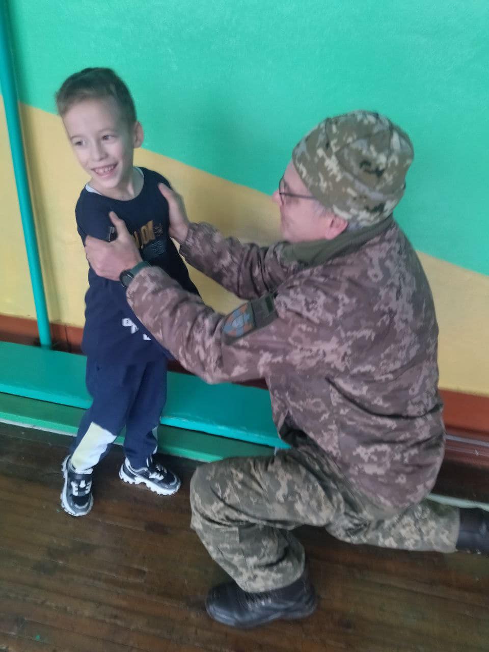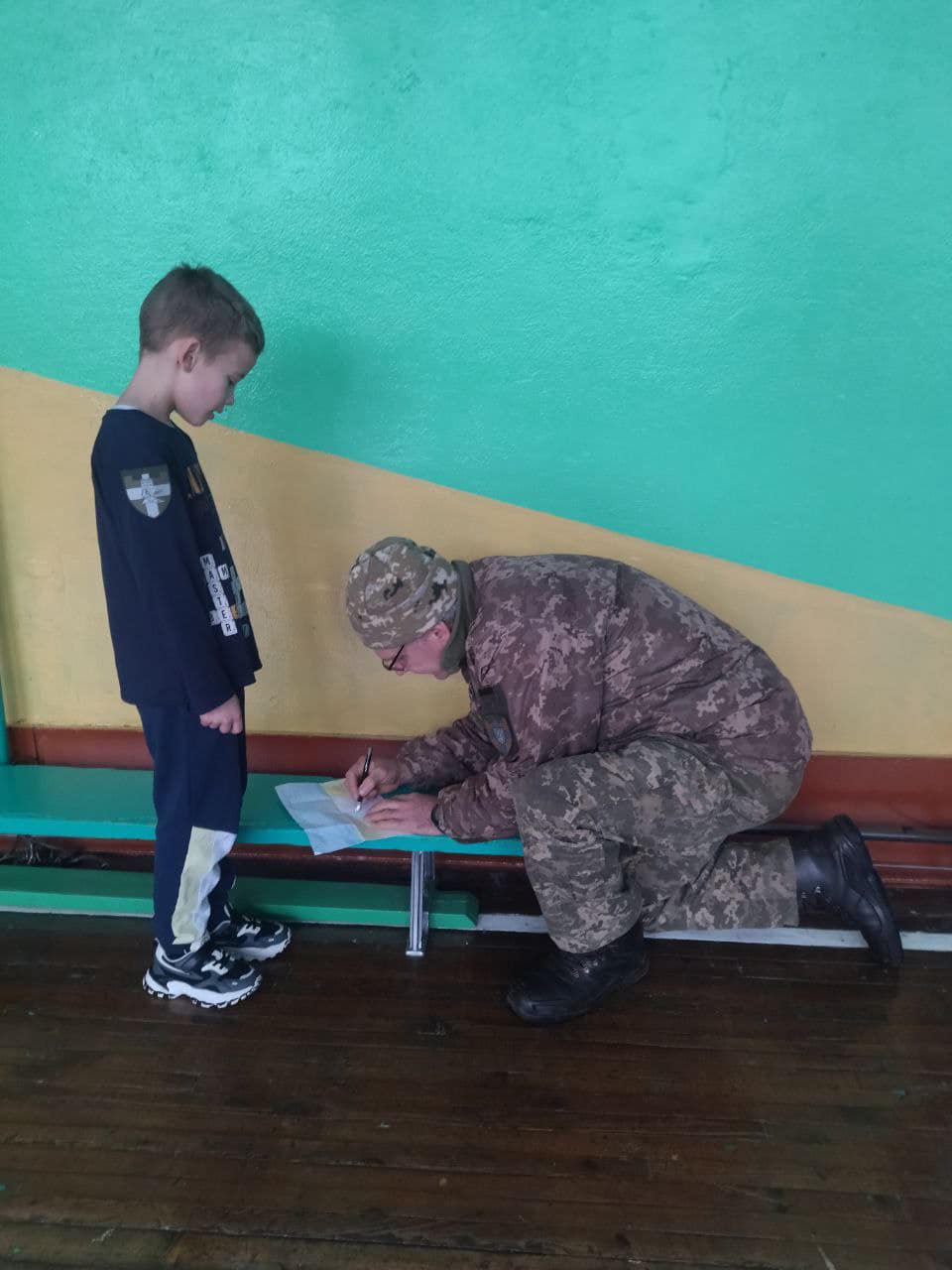 Військовий пригорнув Арсена та подякував хлопчику за малюнок. А на згадку про зустріч написав: «Дуже дякую. Жолдас!».