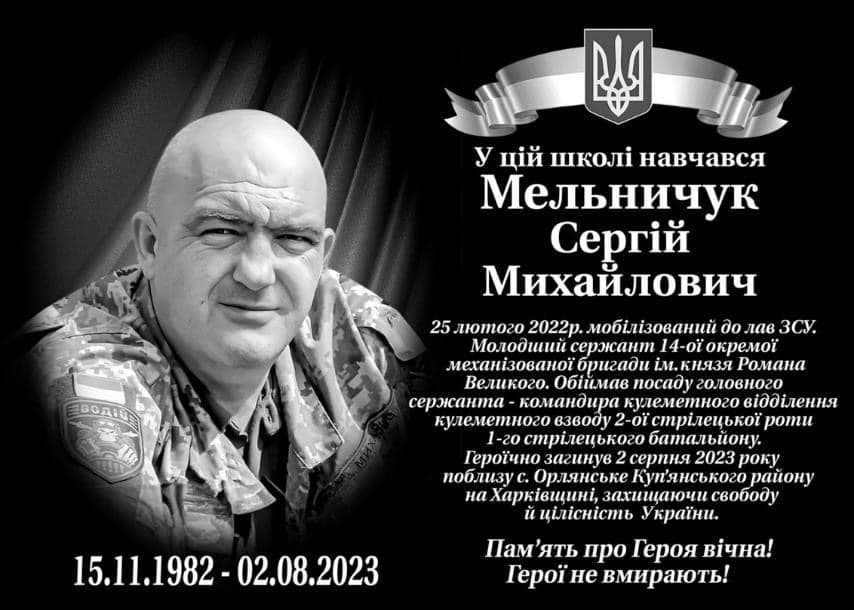 1 лютого 2024 року в ЗЗСО Лобачівський ліцей відбулося урочисте відкриття меморіальної дошки в честь загиблого Героя, випускника закладу Мельничука Сергія Михайловича - молодшого сержанта 14-ої ОМБр імені князя Романа Великого.
