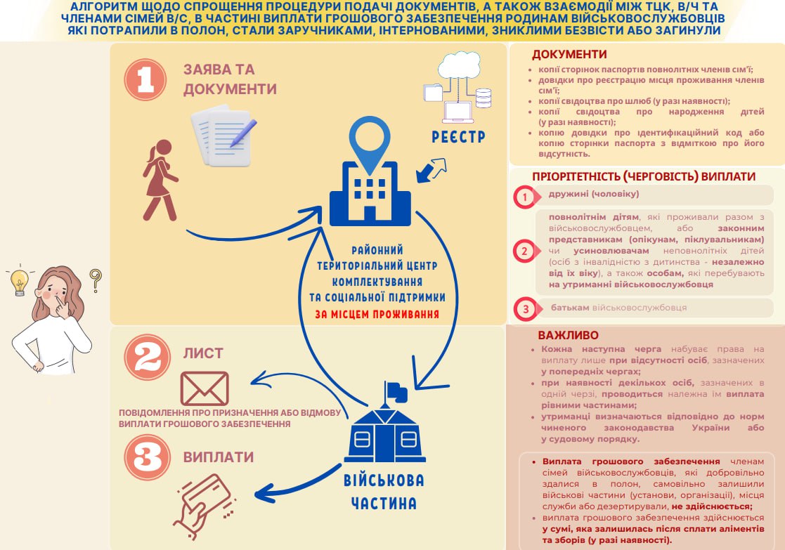«Виплата грошового забезпечення членам сімей військовослужбовців, які добровільно здалися в полон, самовільно залишили військові частини, місця служби або дезертирували, не здійснюється. Виплата грошового забезпечення здійснюється у сумі, яка залишилась після сплати аліментів та зборів (у разі наявності)», - йдеться у публікації Мінреінтеграції.