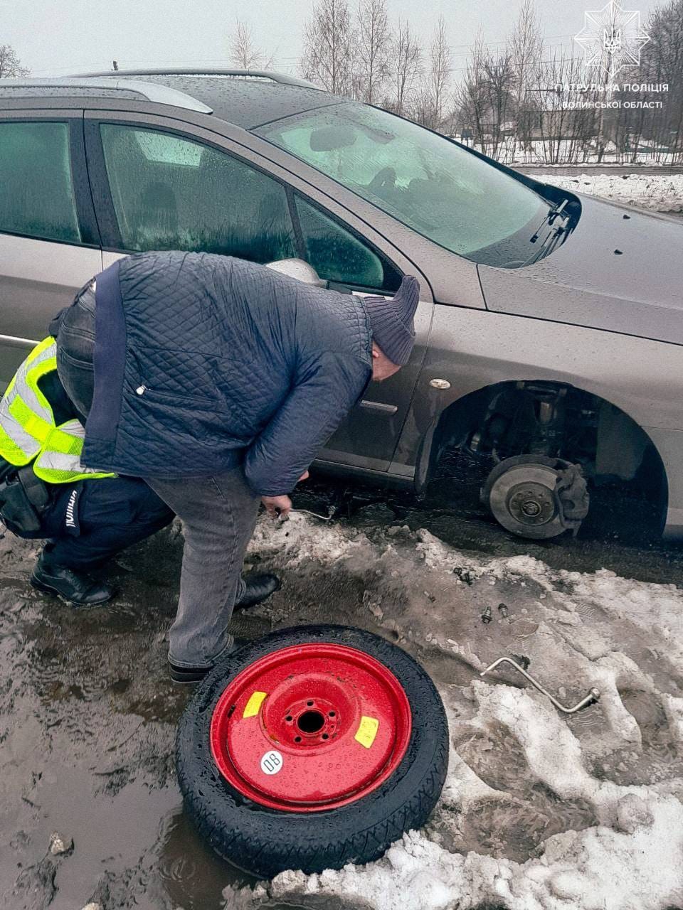 «На вихідних інспектори помітили двох керманичів, у яких виникли труднощі на дорозі через поломку транспортних засобів. Поліцейські допомогли водіям замінити колеса, щоб ті змогли продовжити рух», - йдеться у дописі.