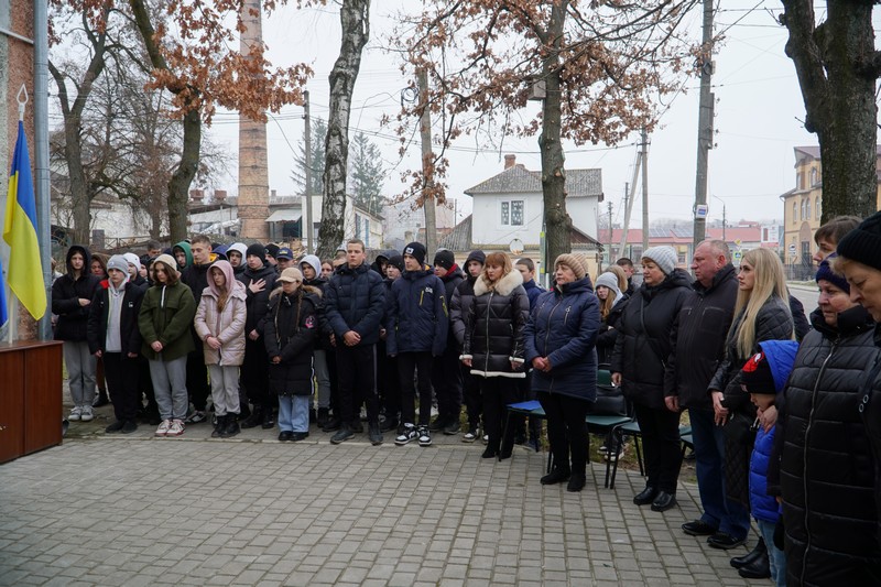 На шкільному подвір’ї, де ще відносно недавно лунали кроки полеглих воїнів, міський голова Ігор Пальонка звернувся до родин захисників та школярів, які взяли участь у цій пам’ятній урочистості: