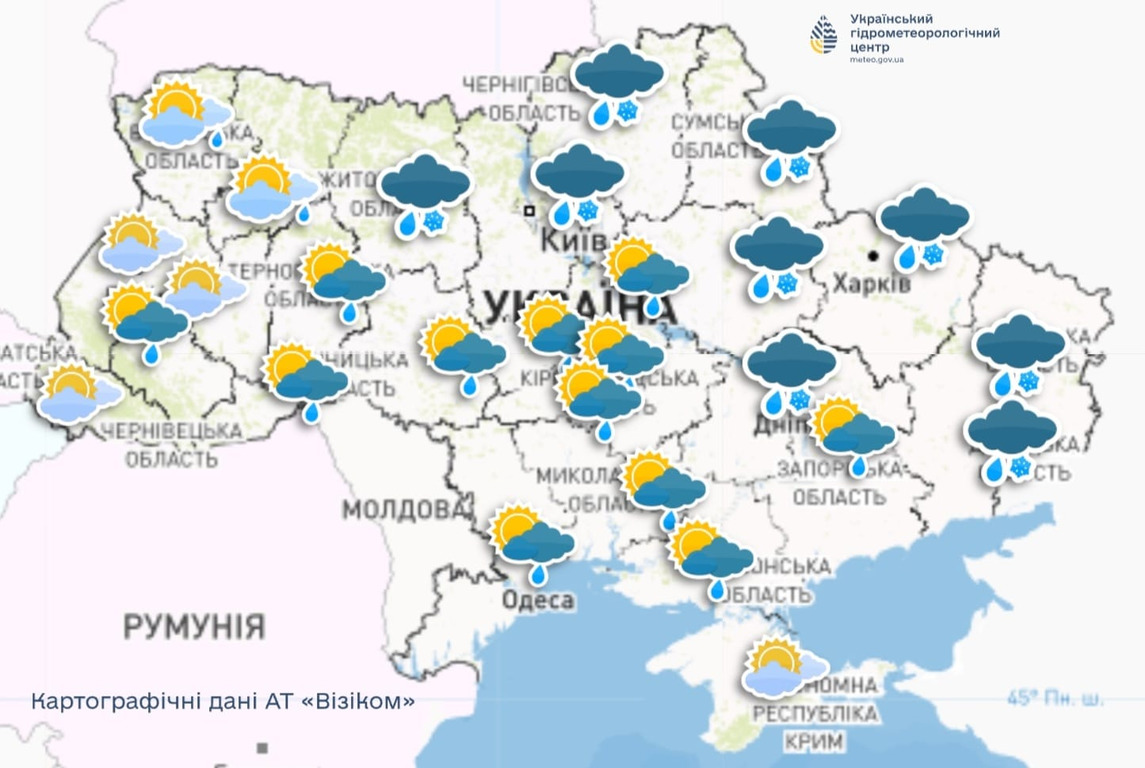 Вночі у західних, північних та центральних областях, вдень в Україні невеликий дощ та мокрий сніг. У південній частині вночі та вранці місцями туман. Вітер південно-західний з переходом на північно-західний, 7-12 м/с. Температура вночі від 2° тепла до 3° морозу, у східних областях 3-8° морозу; вдень 1-6° тепла, на півдні країни та Закарпатті 5-10° тепла.