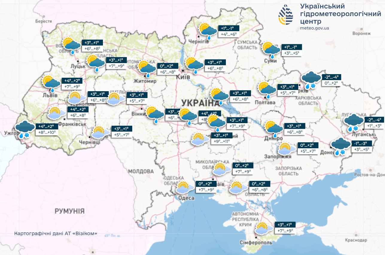 Вдень температура становитиме переважно 3-8° тепла. На Закарпатті, Прикарпатті, Одещині та Миколаївщині стовпчики термометрів покажуть до 11°. На сході та в Карпатах очікується від 2° морозу до 3° тепла.