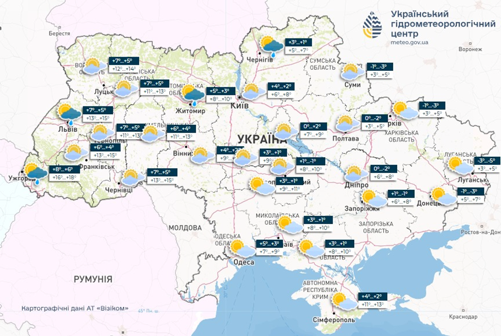 Вдень температура становитиме 5-10° тепла. На півдні Одещини та в Криму підніметься до 14°. У більшості східних областей передбачається 1-6° тепла. На заході найтепліше – температура сягатиме 11-16° тепла.
