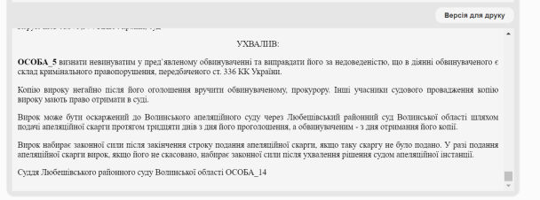 Про це йдеться у вироку Любешівського районного суду Волинської області, - пише ТСН.