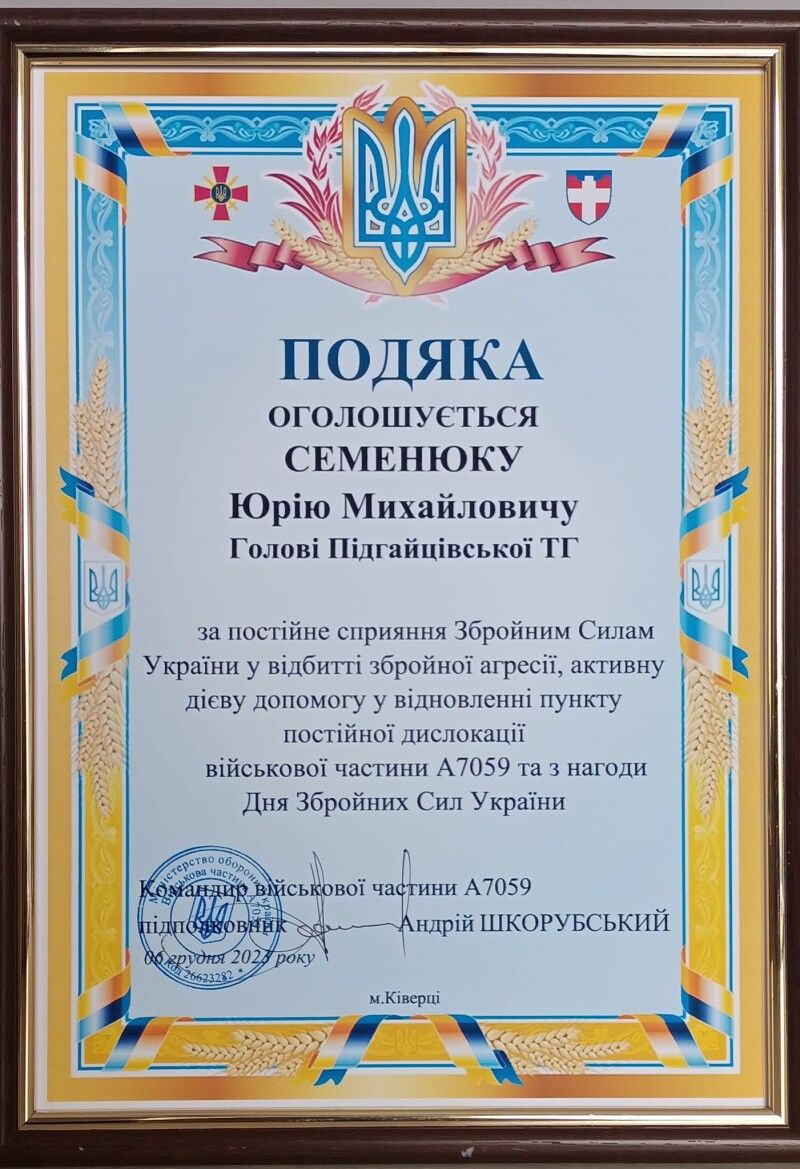 Підгайцівська громада отримала відзнаку від командира військової частини за постійне сприяння ЗСУ.