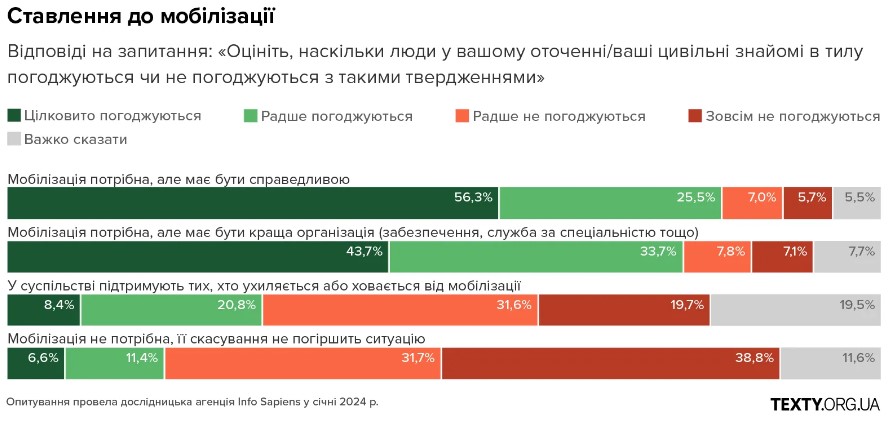 І додає, що ставлення до мобілізації в українців правильне — близько 80% людей вважають, що мобілізація потрібна, але має бути справедливою. Проте, що таке справедливість — потрібно окремо досліджувати.