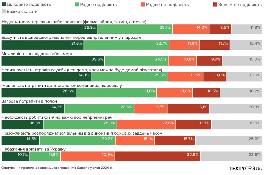 «Ми хотіли подивитись, які фактори заважають чи викликають страх у людей в питанні мобілізації. Рішення йти в армію — складне, тому що це ризик своїм життям, а воно — найбільша цінність для будь-якої людини», — повідомив головний редактор аналітичного видання Texty.org.ua.