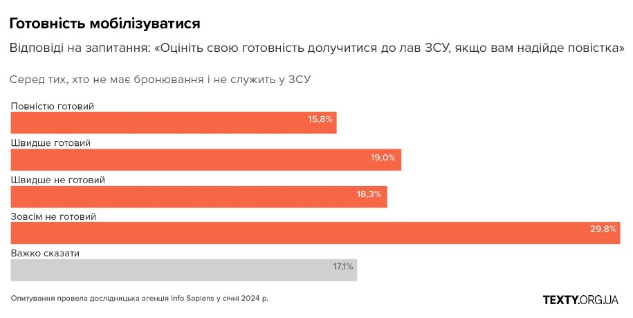 Дослідження показало, що понад 35% чоловіків, які ще не служать, висловили готовність йти в армію, а близько 50% відповіли — швидше готові.