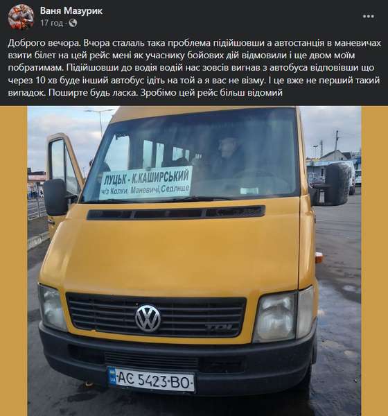 «Вчора сталась така проблема: підійшовши на автостанцію в Маневичах взяти білет на цей рейс, мені як учаснику бойових дій відмовили і ще двом моїм побратимам. Підійшовши до водія водій нас зовсім вигнав з автобуса, відповівши що через 10 хв буде інший автобус: ідіть на той, а я вас не візьму. І це вже не перший такий випадок. Поширте, будь-ласка. Зробімо цей рейс більш відомий», – йдеться в дописі.