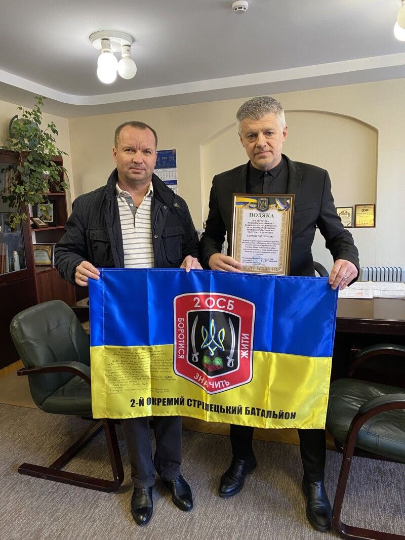 Командир військової частини А7086 Ігор Бурдейний вручив подяку та військовий стяг очільнику цього закладу культури Сергію Скулинцю та його працівникам за надання грошової допомоги ЗСУ.