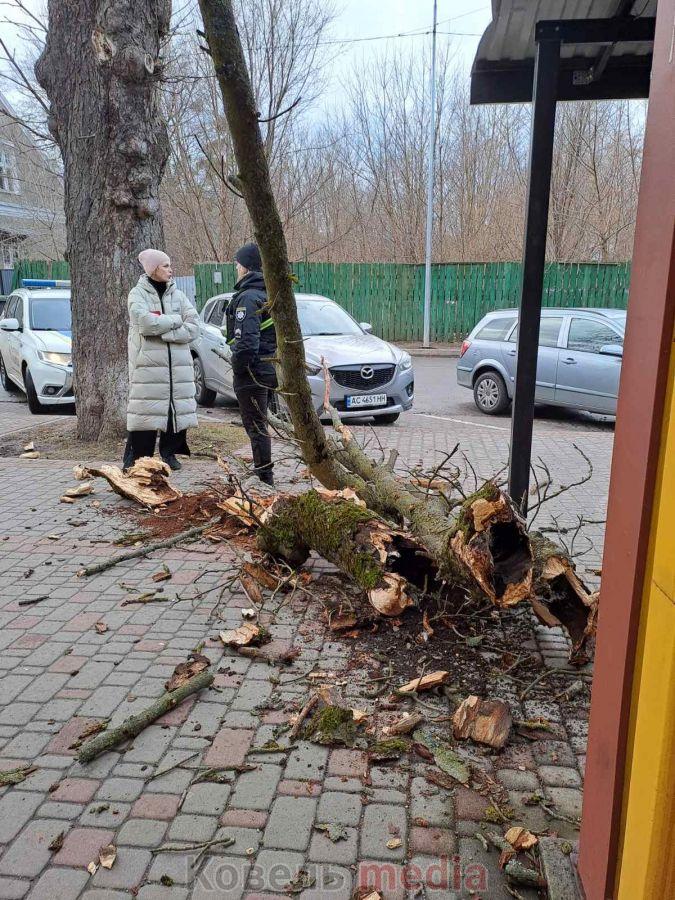 «У Ковелі сильний порив вітру зламав гілку дерева, яка впала на дах закладу торгівлі, розбивши вивіску, та пошкодила капот легкового автомобіля, що був припаркований неподалік», - йдеться у дописі.