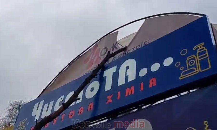 У Ковелі гілка з дерева впала на дах закладу торгівлі, розбивши вивіску, та пошкодила капот припаркованого авто.